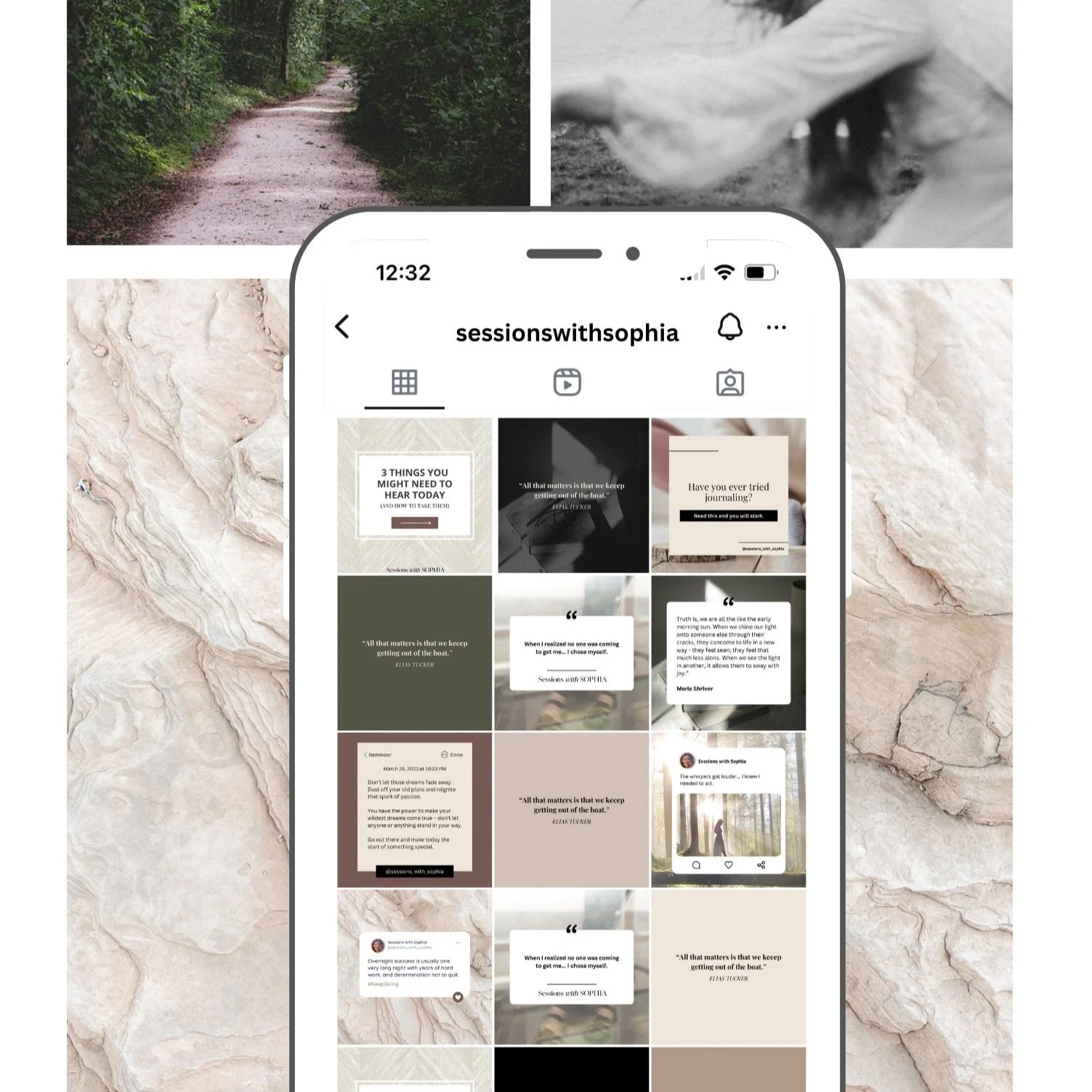 The branded social media content leans into storytelling, gentle guidance, and reflection. Through quotes, journaling prompts, and soft textures, Sophia’s feed became a virtual “safe place to land” for her audience, echoing her deeper mission to help women live more fulfilled, purpose-aligned lives.